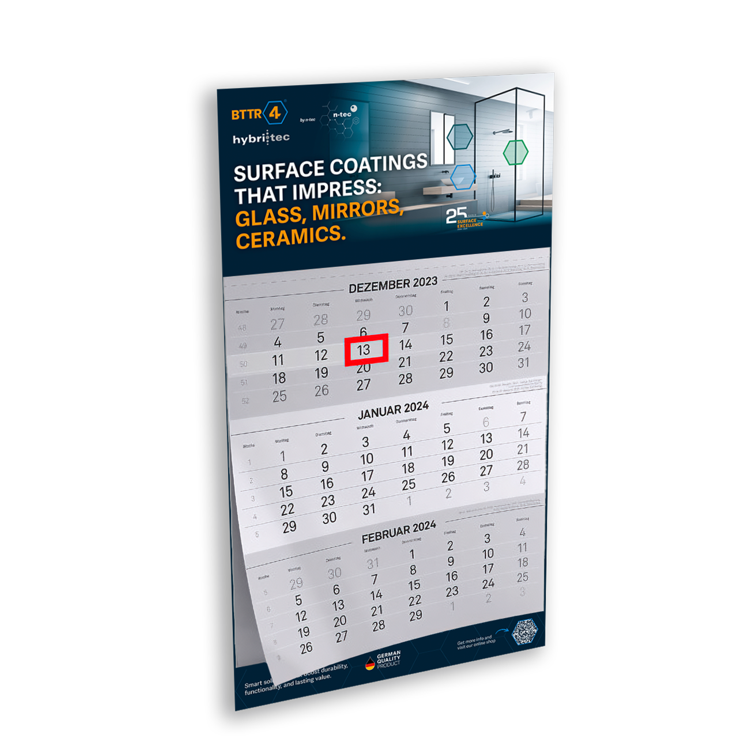 Mit Ihrem BTTR4 Kalender gelingt der optimale Start ins neue Jahr. Hochwertig dank vorgestanzter Perforation, Datumsschieber und Metallvorrichtung zur Befestigung an der Wand.