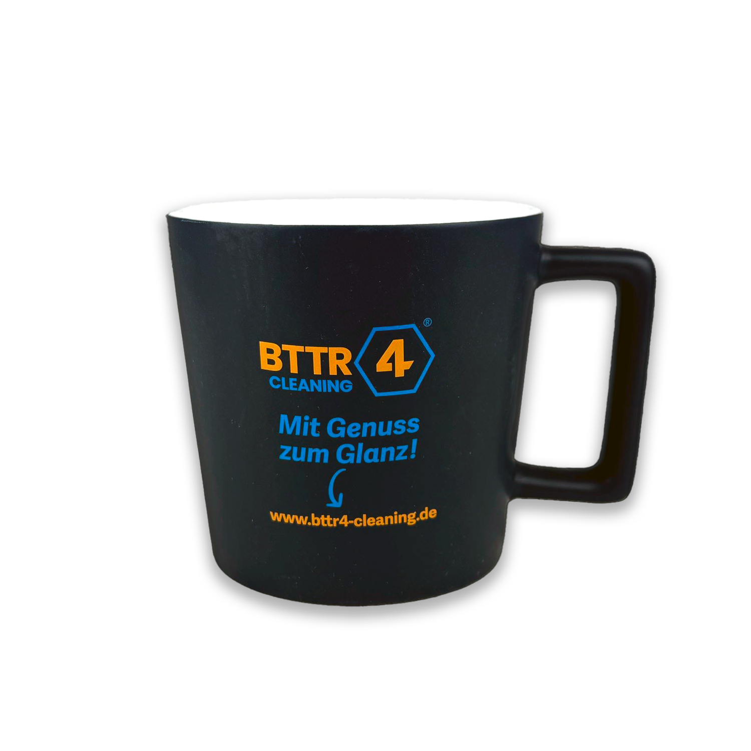 Keramiktasse mit modernem Design, matter Oberfläche und bttr4-cleaning-Logo. Verpackt in einer Box aus Recyclingkarton.